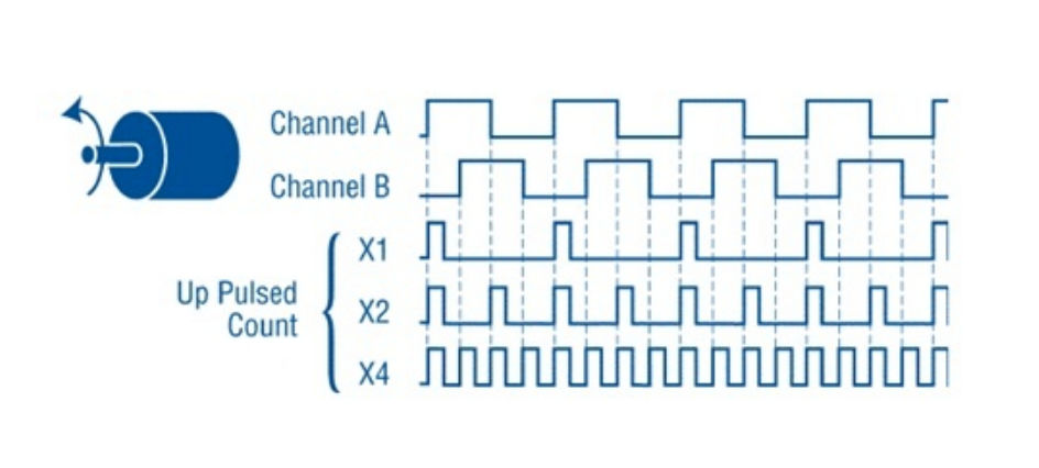 Cada canal fornece um número específico de pulsos igualmente espaçados por rotação (PPR) e o sentido do movimento é detectada pela relação de fase de um canal à frente ou atrás do outro canal.
